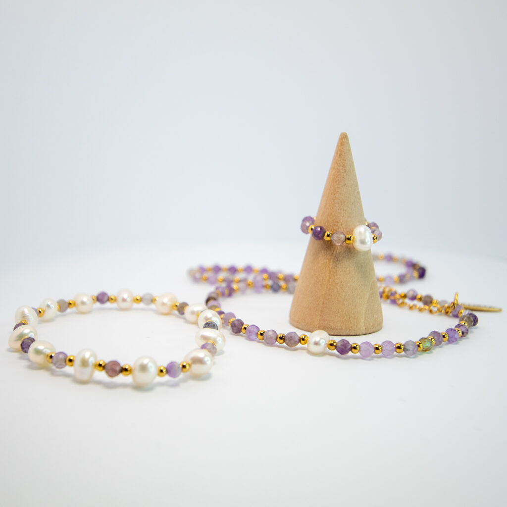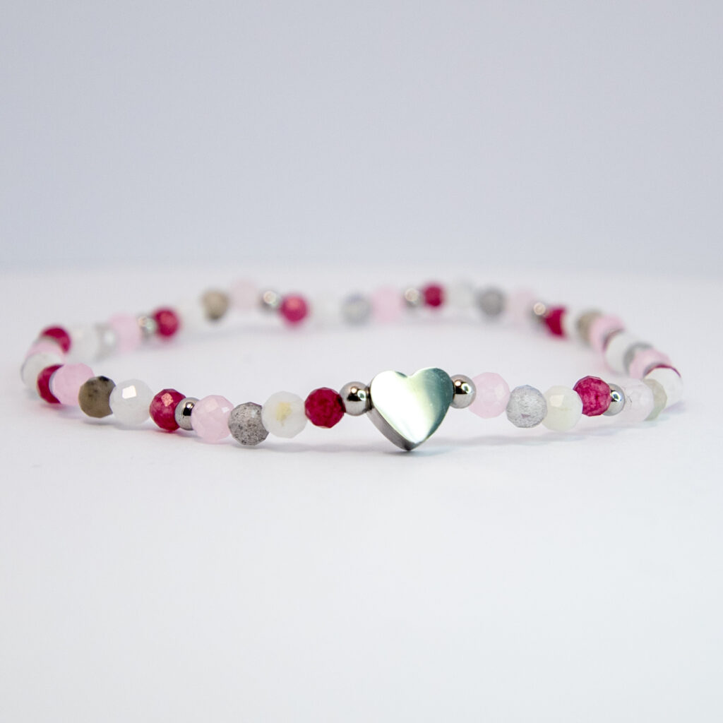 Kolekcja Afrodyta to subtelna oda do kobiecości, miłości i wewnętrznej harmonii, wyrażona przez połączenie kwarcu księżycowego, labradorytu, kwarcu różowego i rubinu. Bransoletka, pierścionek i naszyjnik z tej serii emanują zmysłowością, delikatną energią i siłą płynącą z serca.