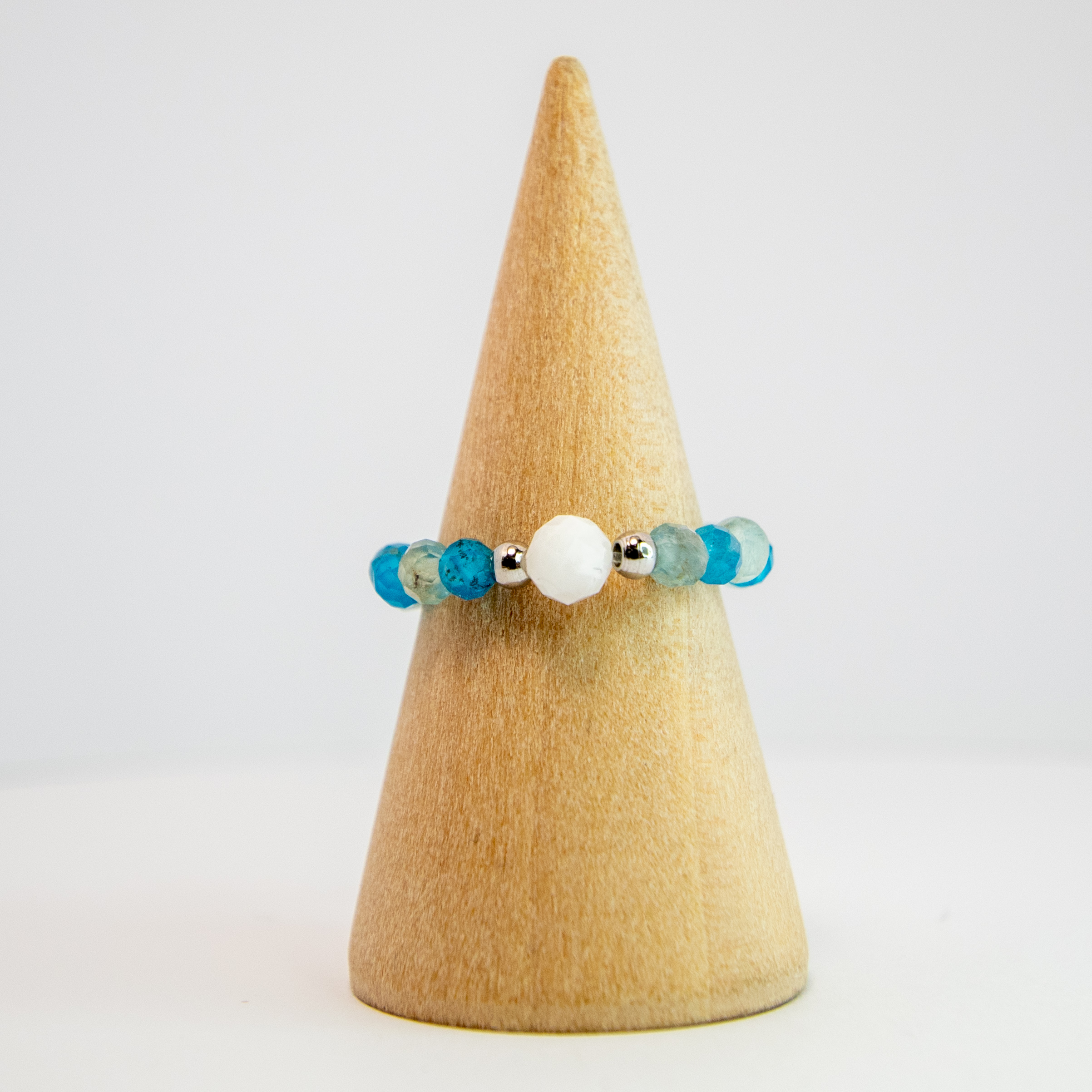 Turkusowy apatyt wprowadza energię kreatywności i świeżości myśli, zaś mlecznobiały kwarc księżycowy przypomina o sile ciszy, refleksji i duchowego światła.